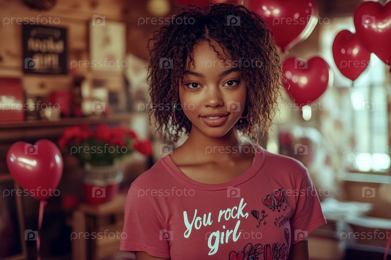 Девочка стоит в гостиной, украшенной цветами и красными шарами в форме сердца к Дню святого Валентина