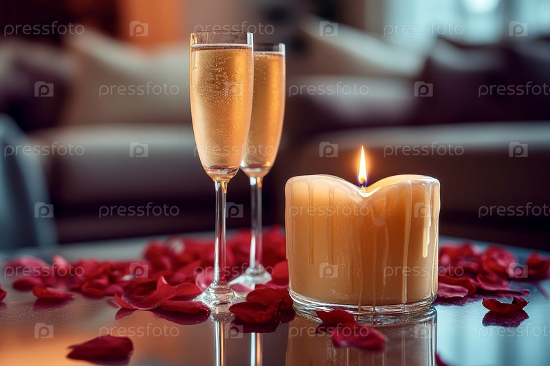 Два бокала шампанского стоят на столе рядом с горящей свечой, окруженной лепестками красных роз в уютной гостиной