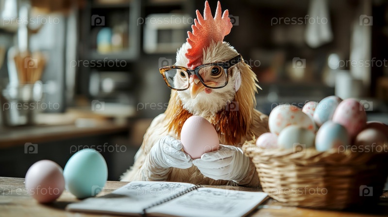 Курица в очках и белых перчатках сидит за кухонным столом и изучает рецепт окраски пасхальных яиц