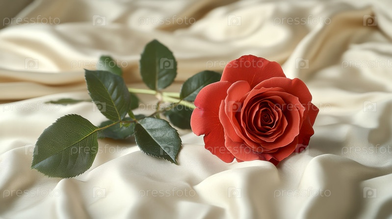 Крупный план красной розы, оставленной на бежевом шелковом постельном белье. Кровать не заправлена, кто-то только что спал на ней, а теперь проснулся и ушел, оставив только один цветок свежей красной красивой розы