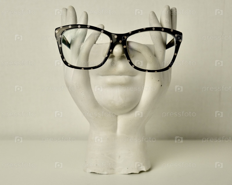 Белая безголовая статуэтка в очках с черной оправой на светлом сплошном фоне