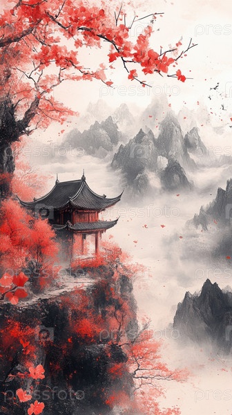 Спокойная сцена традиционного азиатского павильона, окруженного красными цветами, туманными вершинами и мягкими акварельными эффектами. Концепция спокойствия
