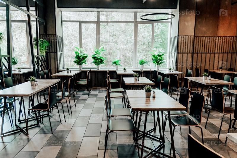 Интерьер летнего кафе, стиль ресторана, дизайн большого обеденного зала