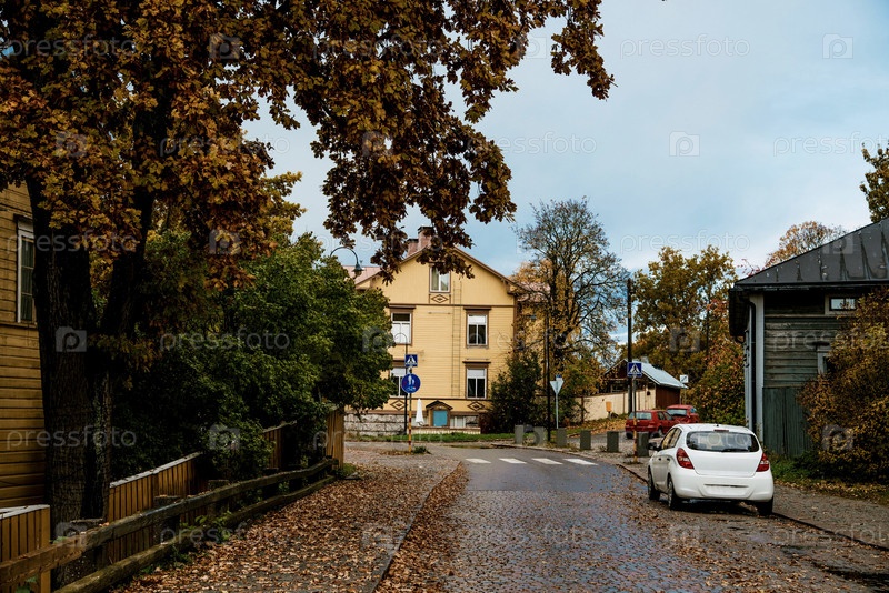 Городская улица в пасмурный дождливый день, заброшенный маленький городок в осенний день