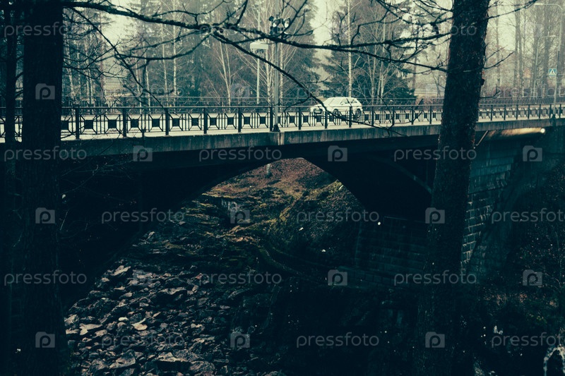 Автомобильный мост через воду, яркий дневной пейзаж, голубое небо и берег реки