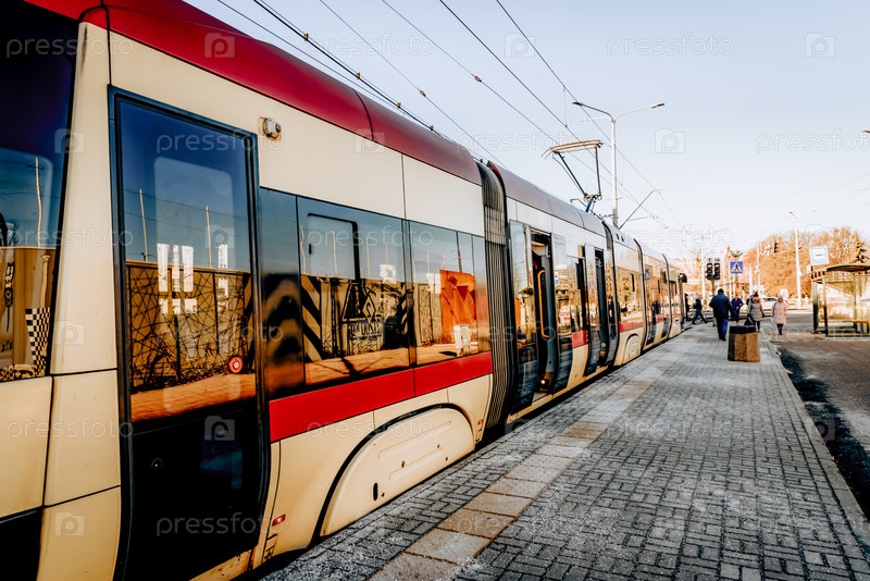 Городской большой трамвай проезжает мимо автобусной остановки, городской пейзаж