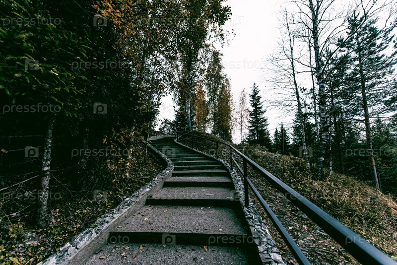 Бетонная лестница в городском парке, лестница на фоне зеленой травы летним днем