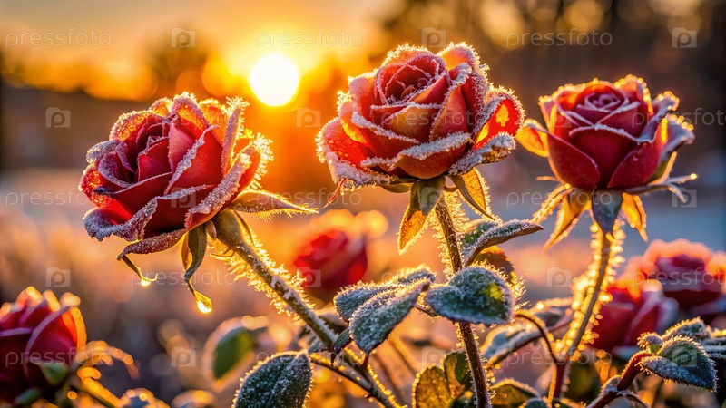 Розы в ледяном инее на закате