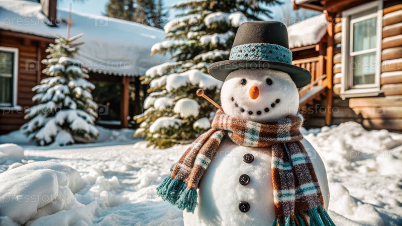 Снеговик на фоне зимнего пейзажа