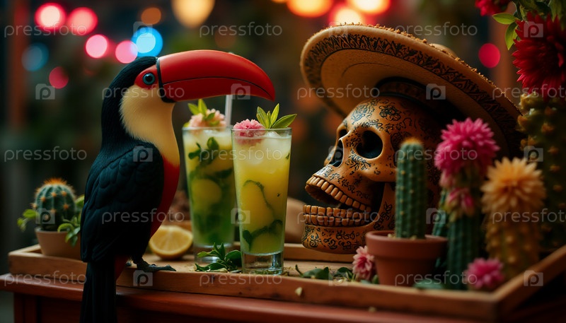 Тукан на фоне подноса с намиткам и черепом