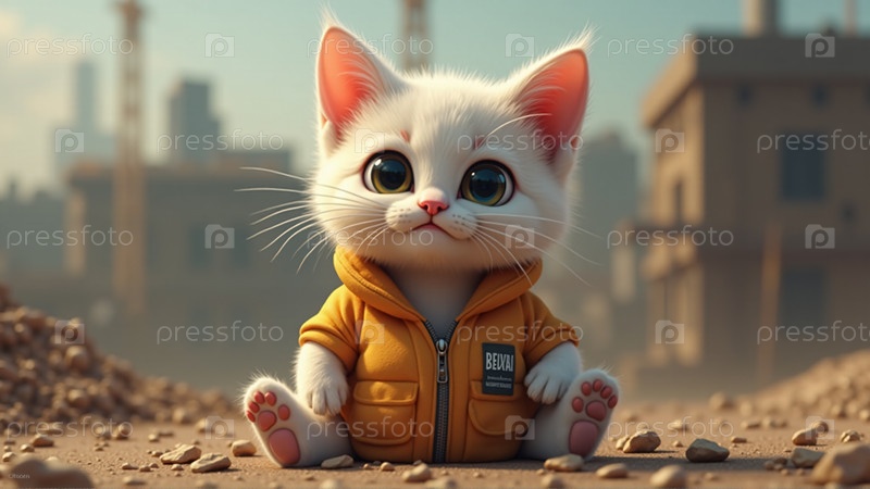 Милый маленький котенок на фоне стройки