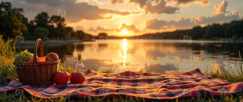 Корзина с фруктами и бутылка вина на клетчатом одеяле у озера