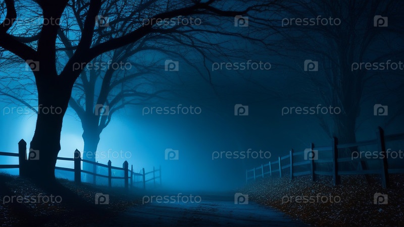 Темный лес с забором на заднем плане. Деревья голые, а небо темное