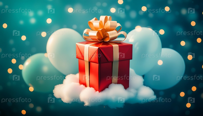 Красная коробка с золотым бантом на облаке из воздушных шаров