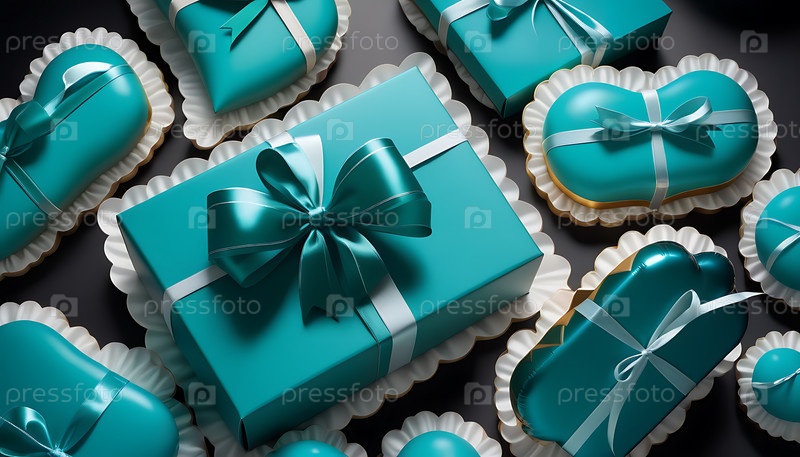 Синяя коробка с бантом окружена другими синими коробками с бантами