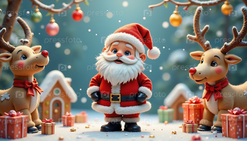 Мультяшное изображение Санта-Клауса, стоящего перед двумя оленями и рождественской елкой. Сцена праздничная и игривая, а олени и елка добавляют праздничного настроения