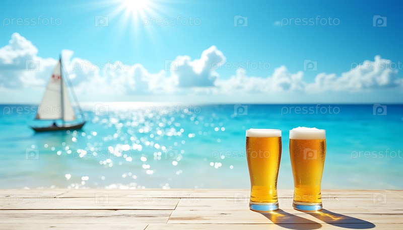 Два бокала пива на столе у океана. Сцена расслабленная и беззаботная, так как пляжная обстановка и напитки предполагают неторопливый день, проведенный за наслаждением солнцем и водой