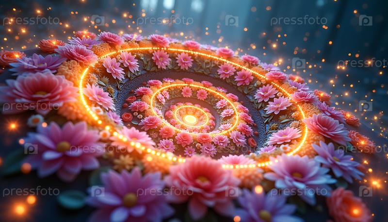 Цветочный дизайн с розовыми и оранжевыми цветами в спирали. Цветы светятся, а дизайн очень красочный и привлекающий внимание