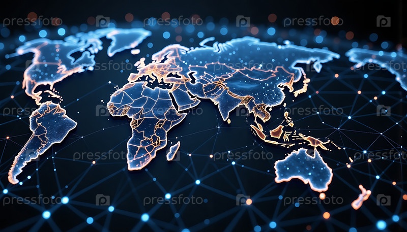 Глобус с сетью линий, соединяющих его. Глобус подсвечен синим и оранжевым цветами