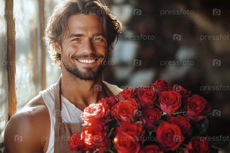 Мускулистый харизматичный улыбающийся мужчина в коричневом фартуке держит букет красных роз
