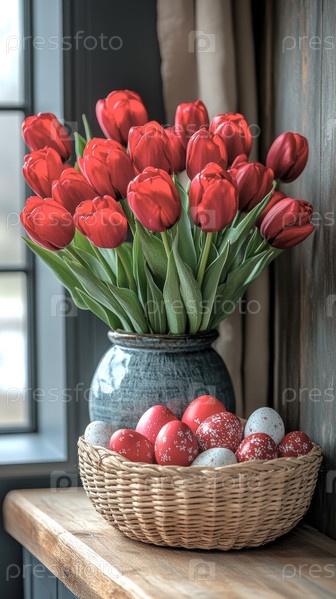 На деревянном столе возле окна стоит ваза с красными тюльпанами и корзина с пасхальными яйцами