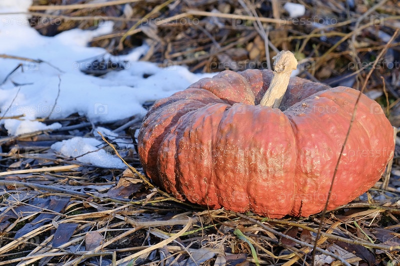 Декоративная и красивая ярко-оранжевая тыква, лежащая на сухой траве и ветках, рядом с ней свежевыпавший снег, освещенный солнечным светом. Осенне-зимняя концепция