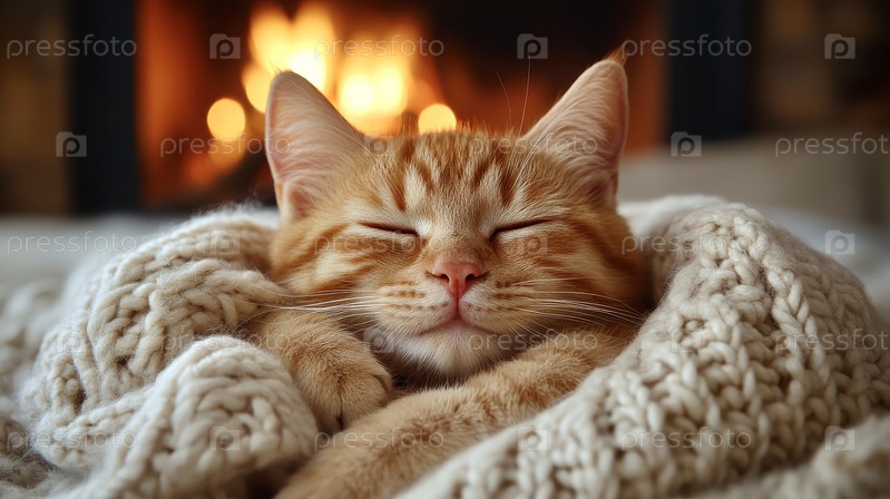 Спящий рыжий кот выглядывает из-под теплого светлого вязаного одеяла. На заднем плане горит камин