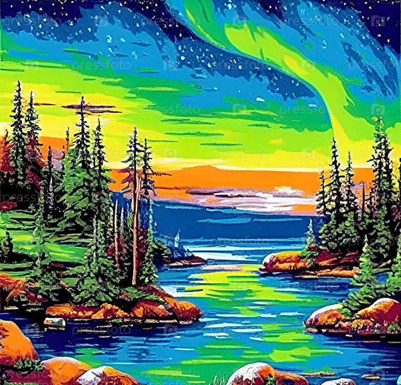 Сказочный зимний пейзаж, праздник, северное сияние ИИ