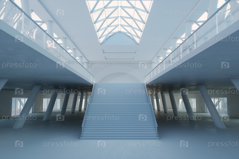 Минималистский интерьер с геометрическими колоннами и широкой лестницей