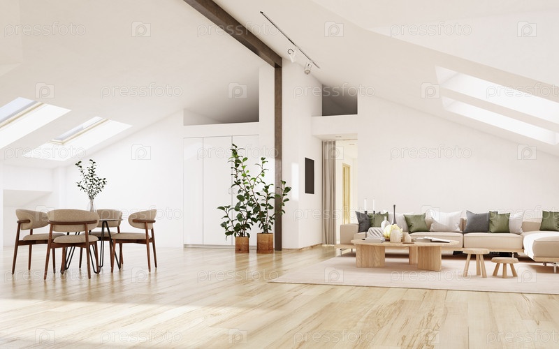 Светлая, минималистичная гостиная в стиле лофт с современной мебелью и естественным освещением. 3D-рендеринг