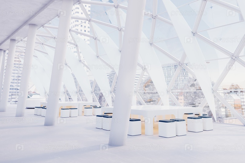 Элегантный офисный кабинет с минималистическим дизайном, длинным столом и большими стеклянными окнами, заполняющими пространство светом. 3D-рендеринг