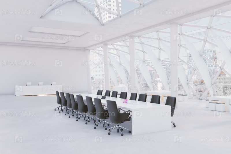 Элегантный офис-конференцзал с минималистическим дизайном, с длинным столом и большими стеклянными окнами, заполняющими пространство светом