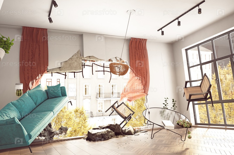 Сюрреалистическая сцена разбитой гостиной с рушащейся стеной. 3D-рендеринг