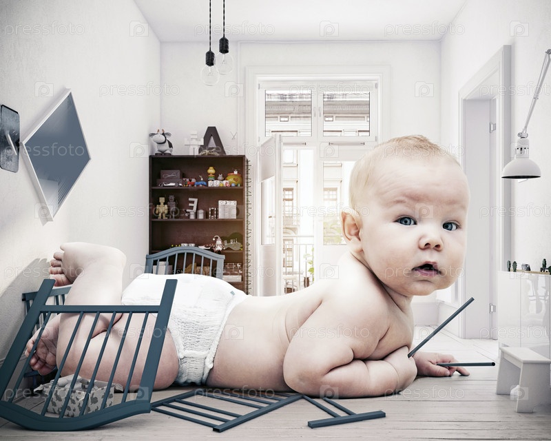Сюрреалистическое изображение гигантского младенца в современной детской комнате, лежащего рядом с сломанной кроватью, создает юмористическую и творческую фантастическую обстановку