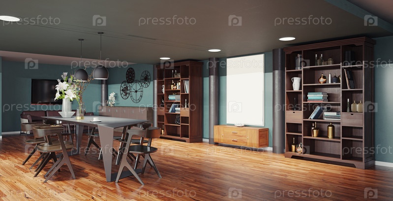 Современный дизайн интерьера столовой. 3d визуализация концепции идеи