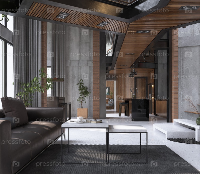 Современная гостиная в стиле лофт с деревянными акцентами, растениями, открытой планировкой. 3D-рендеринг