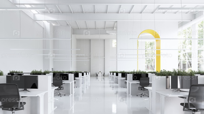Элегантное современное офисное пространство с естественным освещением и зеленью. 3D-рендеринг