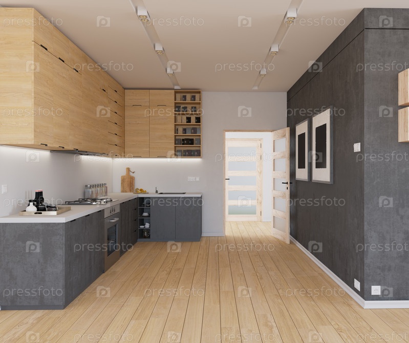 Современная минималистическая кухня с естественным освещением и деревянными акцентами. 3D-рендеринг