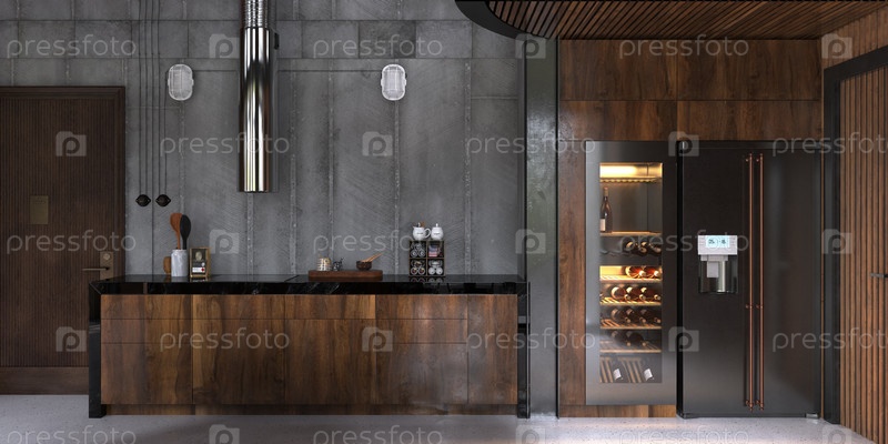 Современная кухня в индустриальном стиле с отделкой из дерева и металла. 3D-рендеринг
