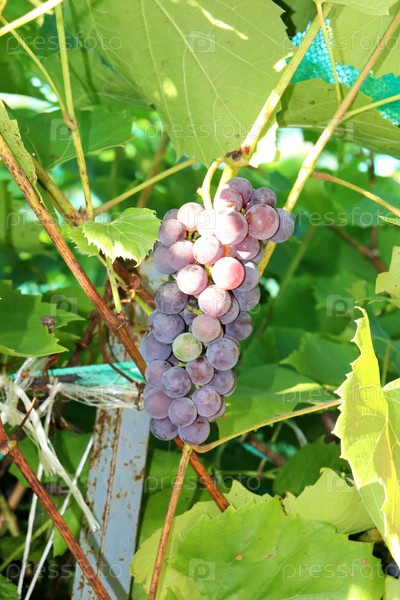 Гроздья полузрелого розового винограда на лозе, куст в полутени