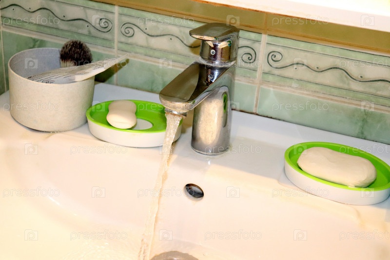 Хромированный кран с проточной водой и частью раковины, мыло, стакан с помазком для бритья