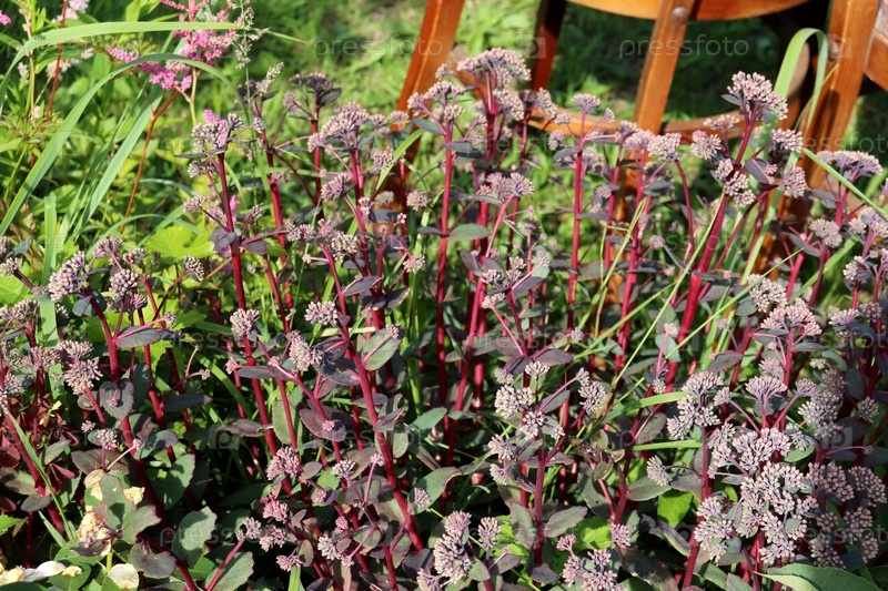 Куст красных цветов седума гибридного на клумбе в саду в солнечный день
