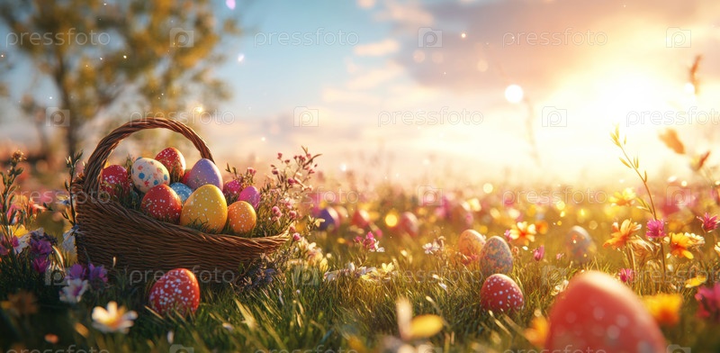 Плетеная корзина, наполненная красочными пасхальными яйцами, стоит на ярком лугу, украшенном различными цветами под ярким небом. Величественные горы возвышаются на заднем плане, когда садится солнце
