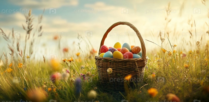 Плетеная корзина, наполненная красочными пасхальными яйцами, стоит на ярком лугу, украшенном различными цветами под ярким небом. Величественные горы возвышаются на заднем плане, когда садится солнце