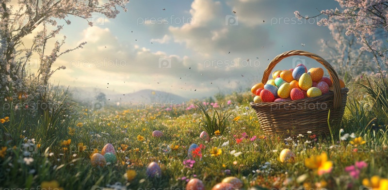 Плетеная корзина, наполненная красочными пасхальными яйцами, стоит на ярком лугу, украшенном различными цветами под ярким небом. Величественные горы возвышаются на заднем плане, когда садится солнце