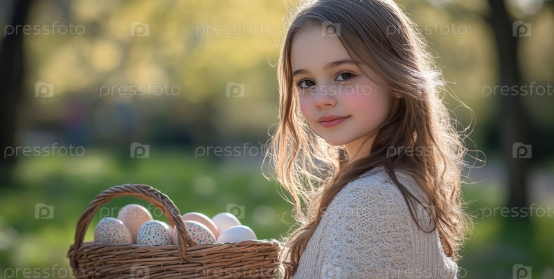 Молодая девушка держит в корзине разноцветные пасхальные яйца и тепло улыбается на мягко размытом фоне