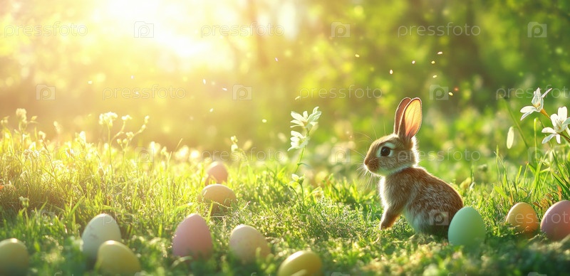 Кролик среди красочных пасхальных яиц в залитом солнцем саду весной