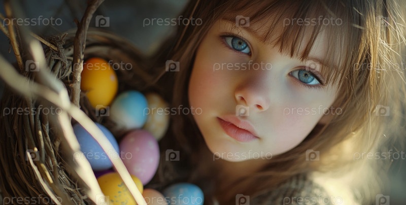 Молодая девушка держит в корзине разноцветные пасхальные яйца и тепло улыбается на мягко размытом фоне