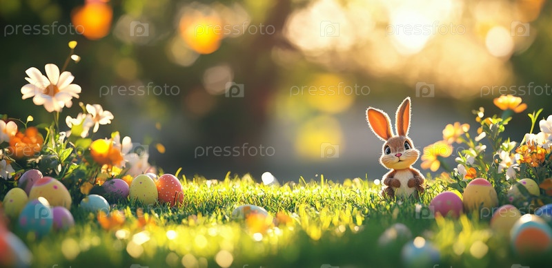 Кролик среди красочных пасхальных яиц в залитом солнцем саду весной