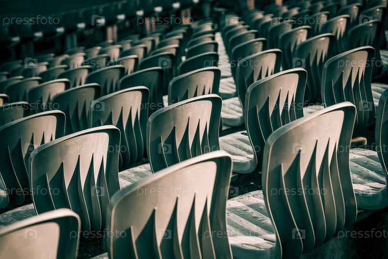 Сектор на арене стадиона, ряды пластиковых серых сидений амфитеатра, пасмурный день